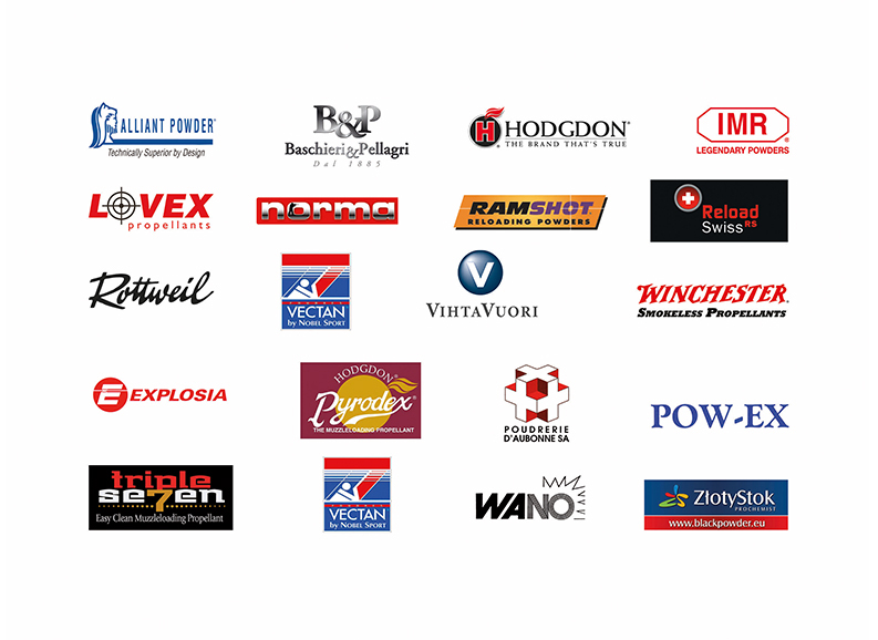 ALLIANT, VIHTAVUORI, ROTTWEIL, LOVEX, HODGDON, IMR, NORMA, RAMSHOT, SWISS RELOAD, WINCHESTER, VECTAN, B&P BASCHIERI & PELLAGRI